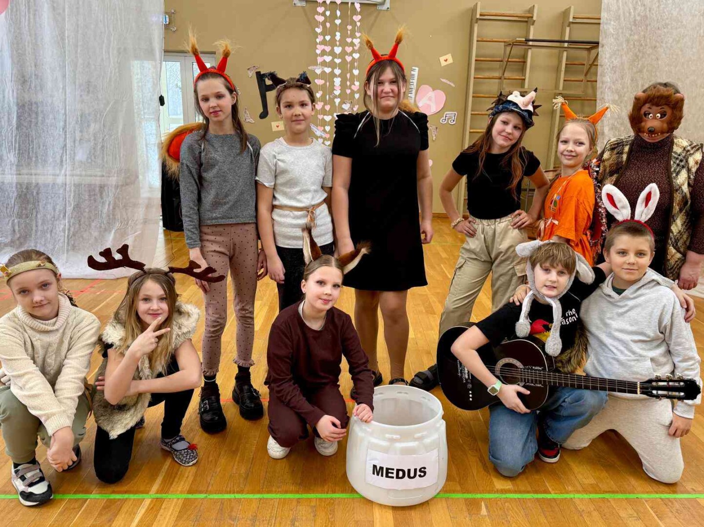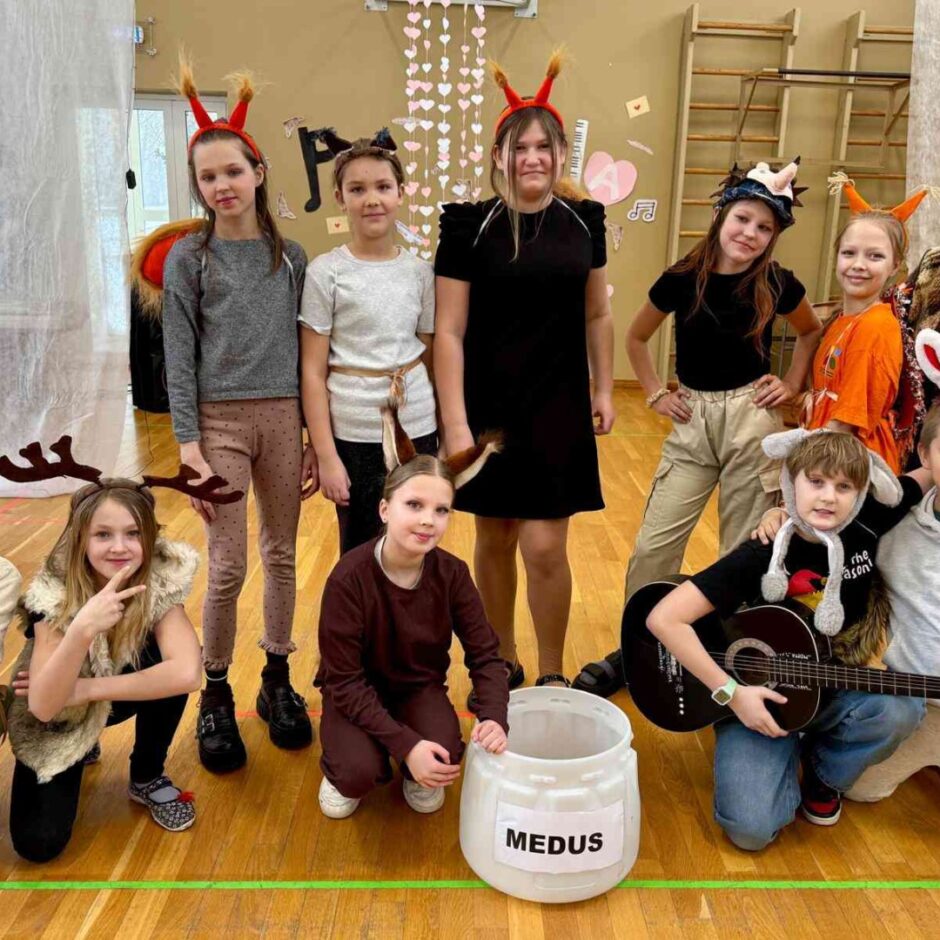 - vietu dalīja abas bērnu dārzu grupiņas ar dziesmām “Saule un mēness” un “Vāram zupu” un 6.klase ar dziesmu “Es šonakt sēdēšu uz jumta”;