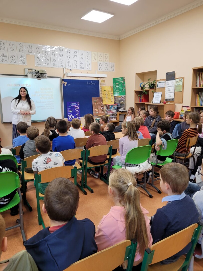 Šī gada Karjeras nedēļas tēma ir “Zaļā karjera Tavai nākotnei”, kad aicinām skolēnus kopīgi domāt par ilgtspēju karjeras attīstībai, zaļo prasmju nozīmi un atbildīgu dzīvesveidu. Jaunāko klašu skolēni, tiekoties ar Šķirošanas stacijas un poligona “BRAKŠĶI” pārstāvi Mariju Ņedorezovu, izspēlēja praktisku spēli par dabai draudzīgiem iepakojuma materiāliem, kā arī mācījās tos atbilstoši sašķirot pēc pārstrādes un otrreizējās izmantošanas iespējām.