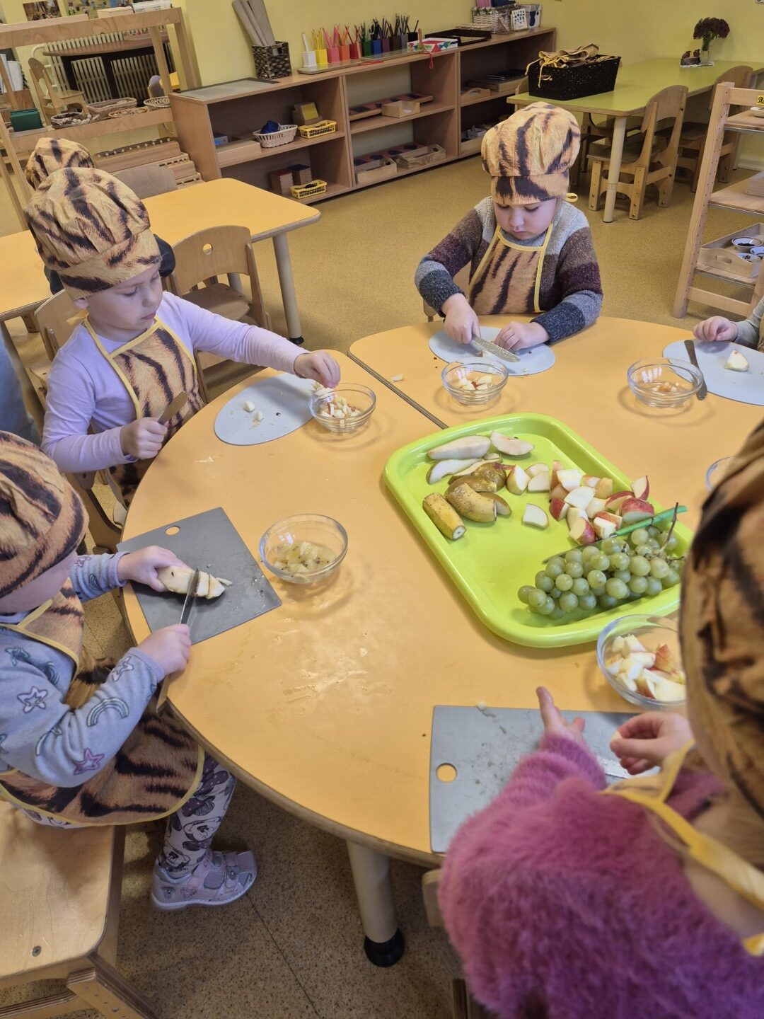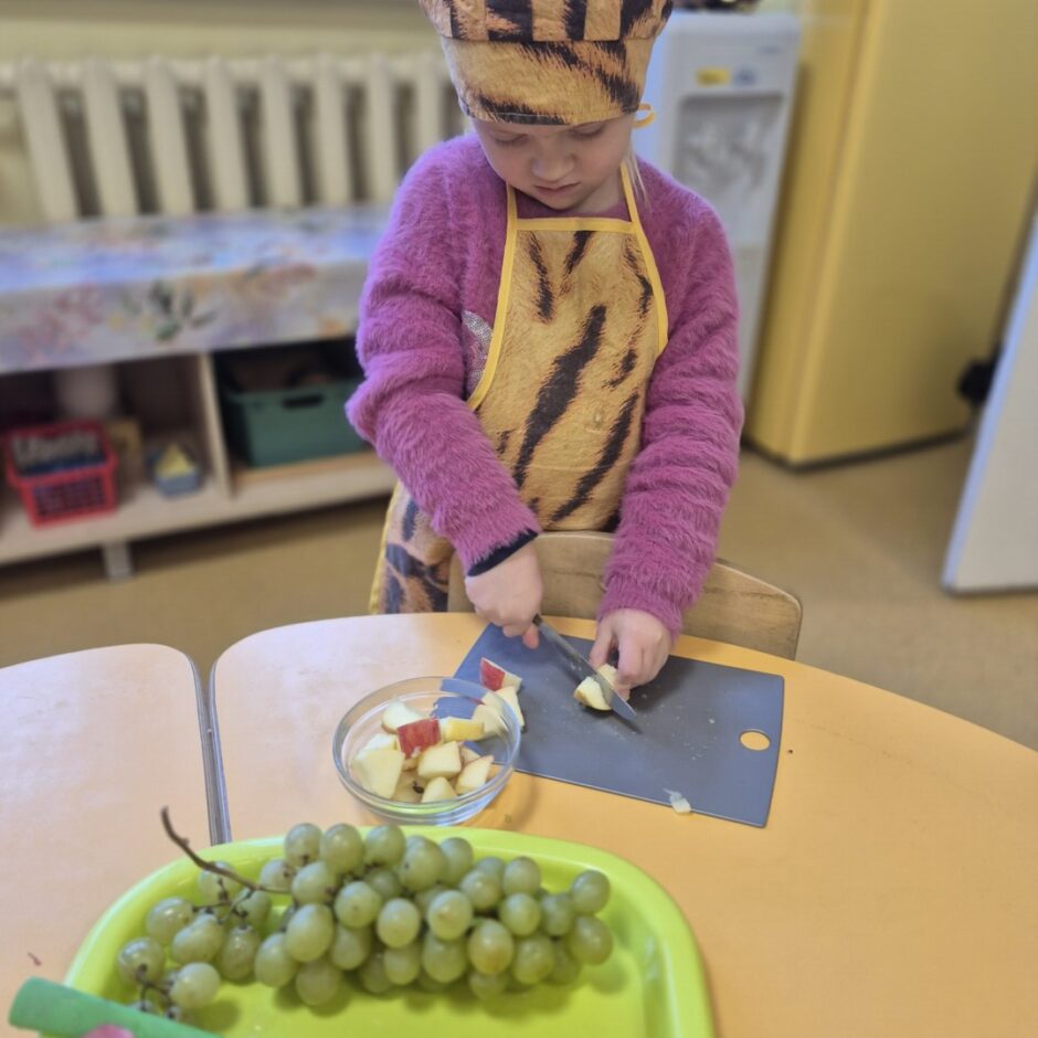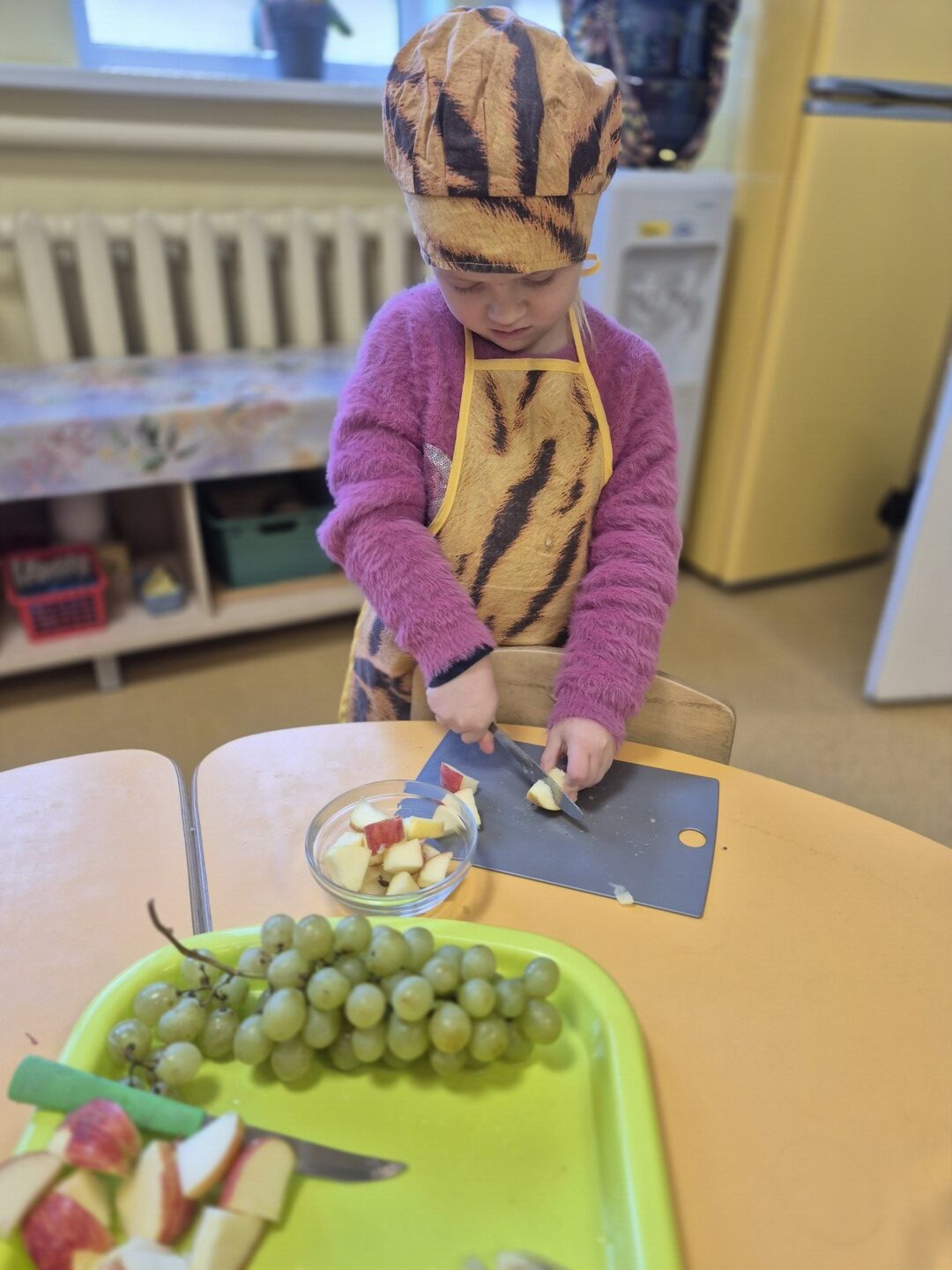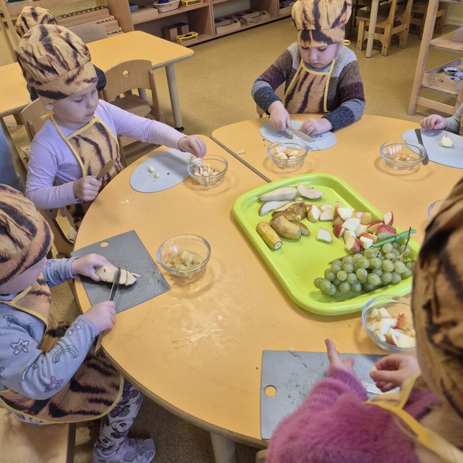 Grupu “Taurenīši” un “Ežuki” bērni izzināja dažādus dārzeņus un augļus. Apguva praktiskās dzīves iemaņas – mizoja, rīvēja, grieza un spieda sulu. Paralēli tam mācījās atpazīt dārzeņus un augļus, nosaukt tos, kā arī salīdzināt pēc krāsas, lieluma un formas. Arī radošajos darbos tika atspoguļoti augļi un dārzeņi.