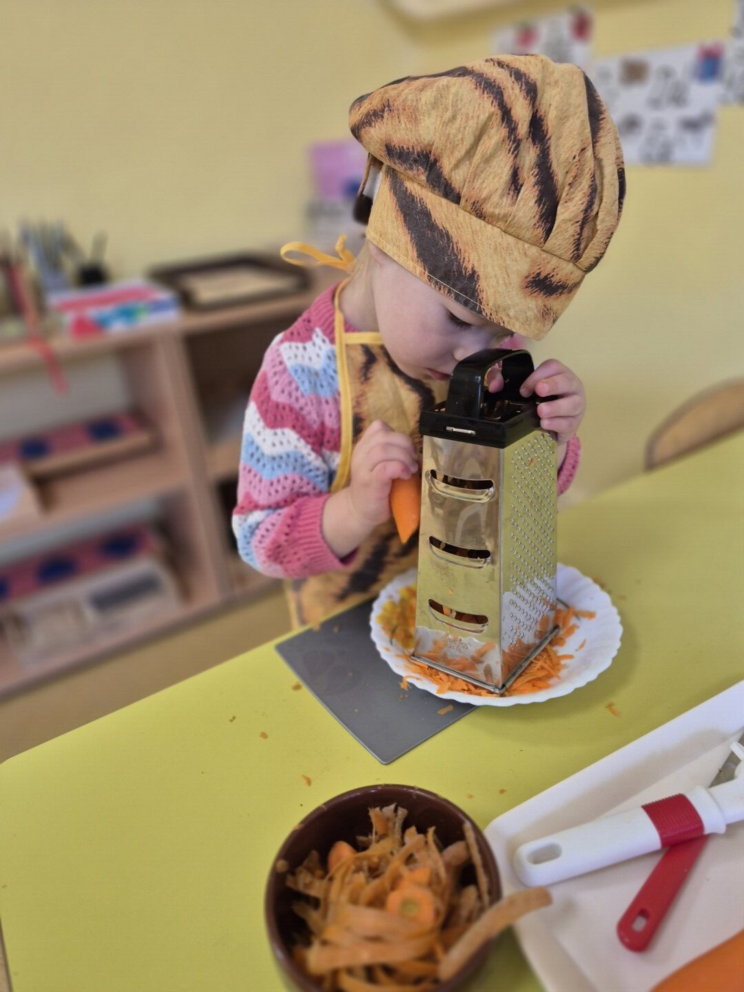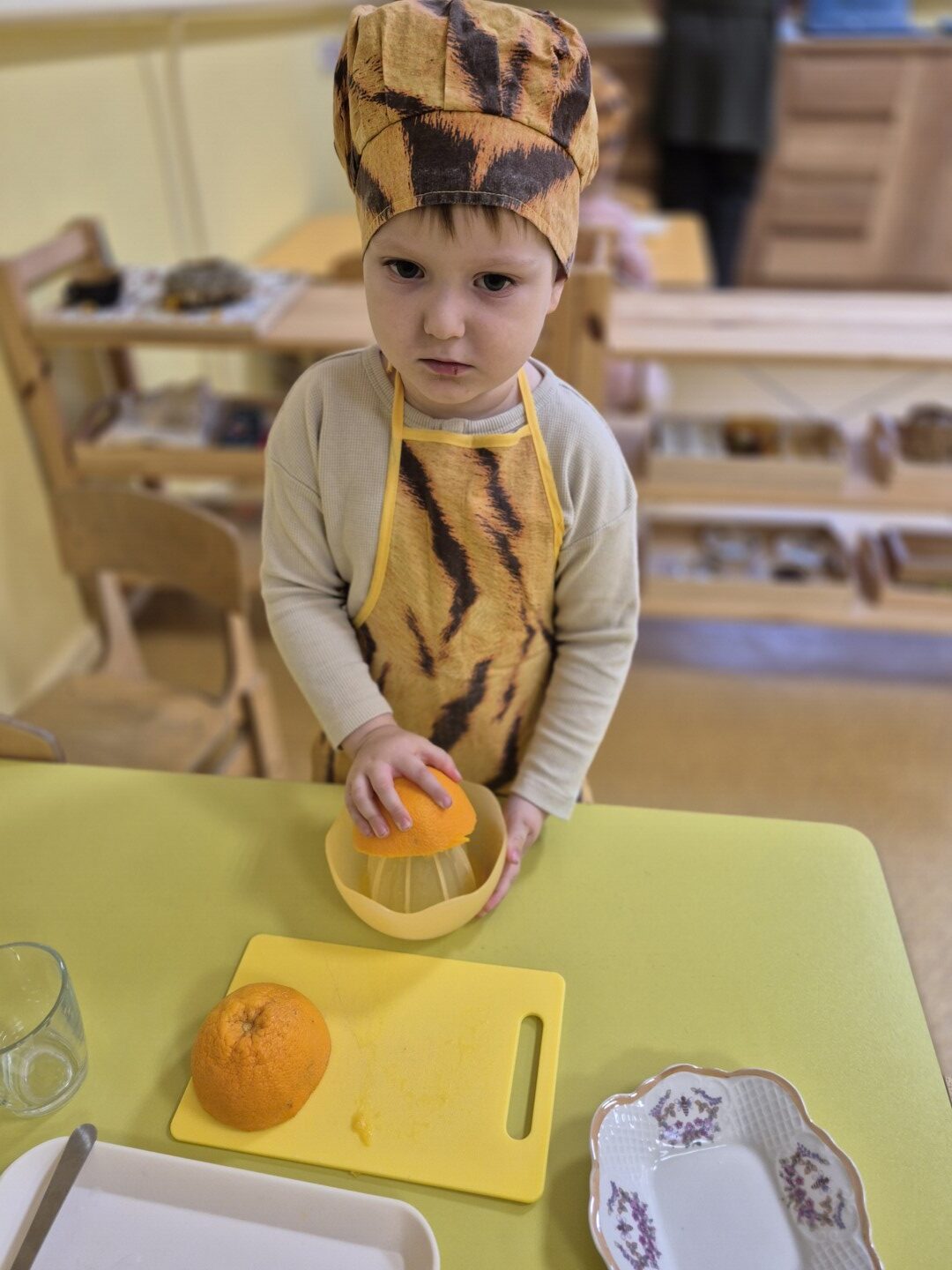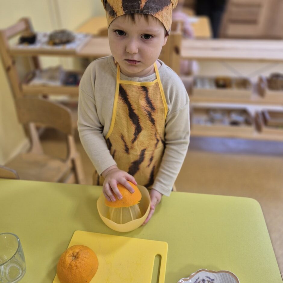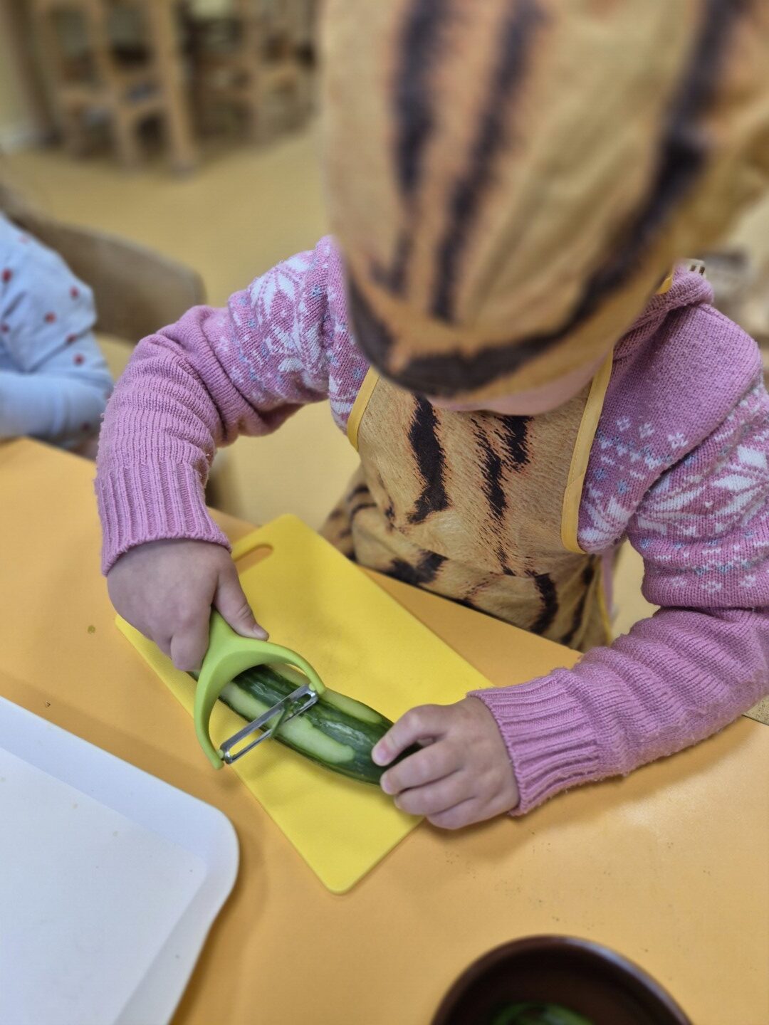 Grupu “Taurenīši” un “Ežuki” bērni izzināja dažādus dārzeņus un augļus. Apguva praktiskās dzīves iemaņas – mizoja, rīvēja, grieza un spieda sulu. Paralēli tam mācījās atpazīt dārzeņus un augļus, nosaukt tos, kā arī salīdzināt pēc krāsas, lieluma un formas. Arī radošajos darbos tika atspoguļoti augļi un dārzeņi.