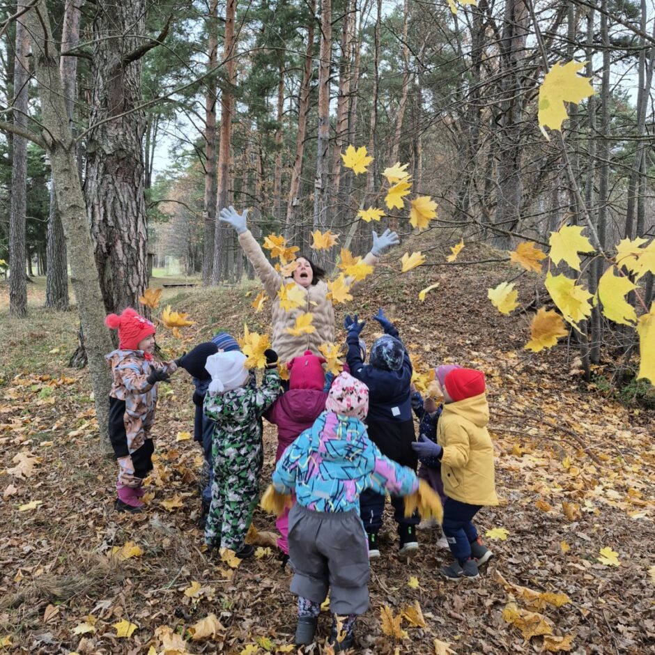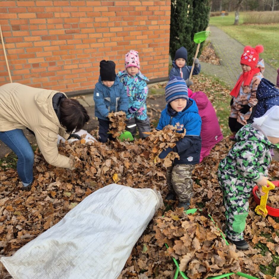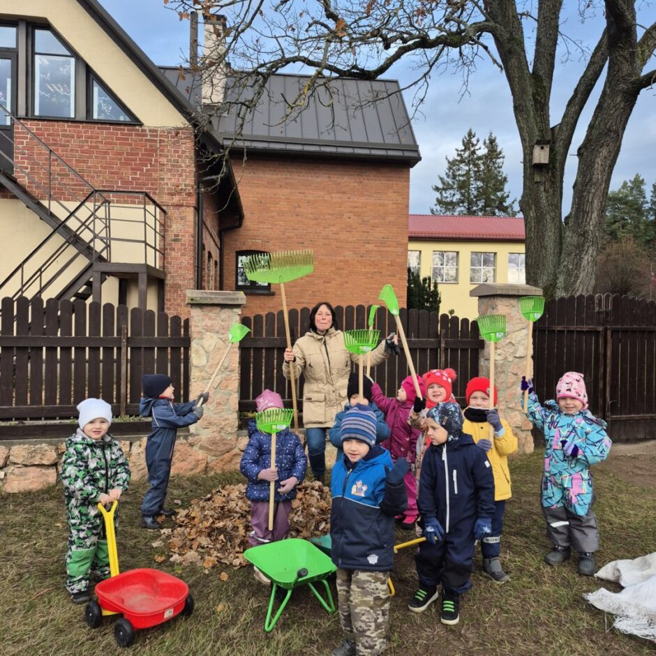 Saulainās oktobra dienās grupu “Ežuki” un “Taurenīši” bērni kopā ar skolotājām un skolotāju palīgiem čakli strādāja grupu laukumā, lai sagrābtu un aiznestu nobirušās koku lapas.