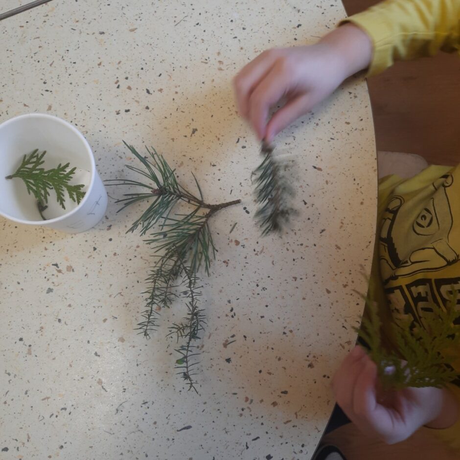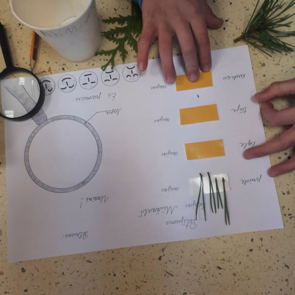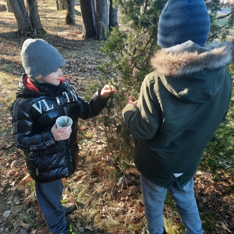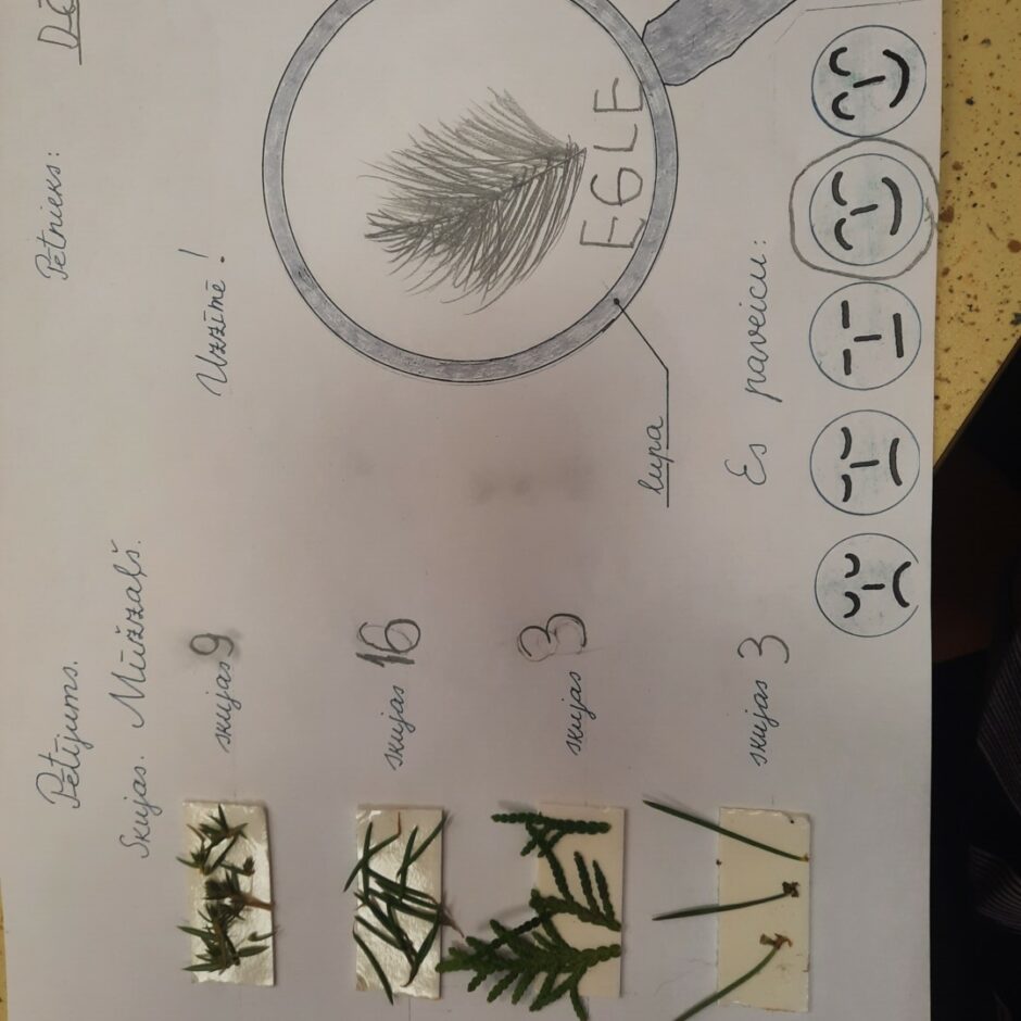 Bērnos lielu interesi un prieku raisīja mūžzaļo augu pētīšana skolas apkārtnē. Bērni atrada un atpazina mūžzaļos augus tuvākajā apkārtnē, bagātināja vārdu krājumu ar mūžzaļo augu nosaukumiem, pētīja un salīdzināja to skujas un lapas. Rotaļnodarbības beigās katrs bērns novērtēja sava darba rezultātu.