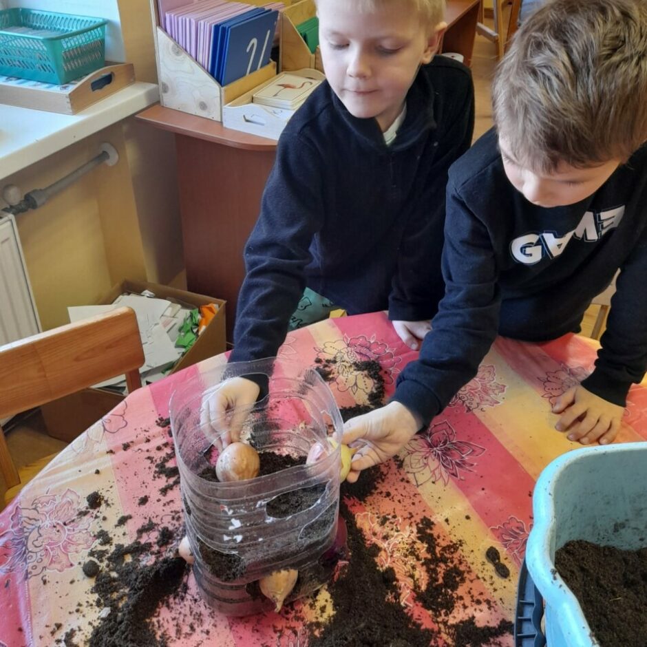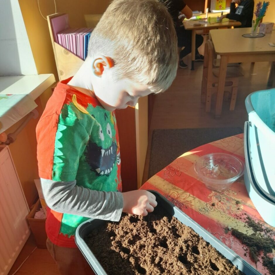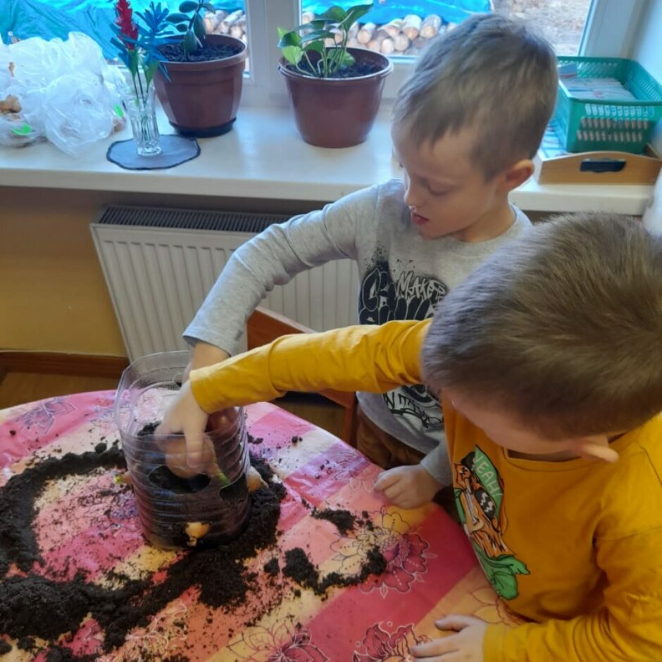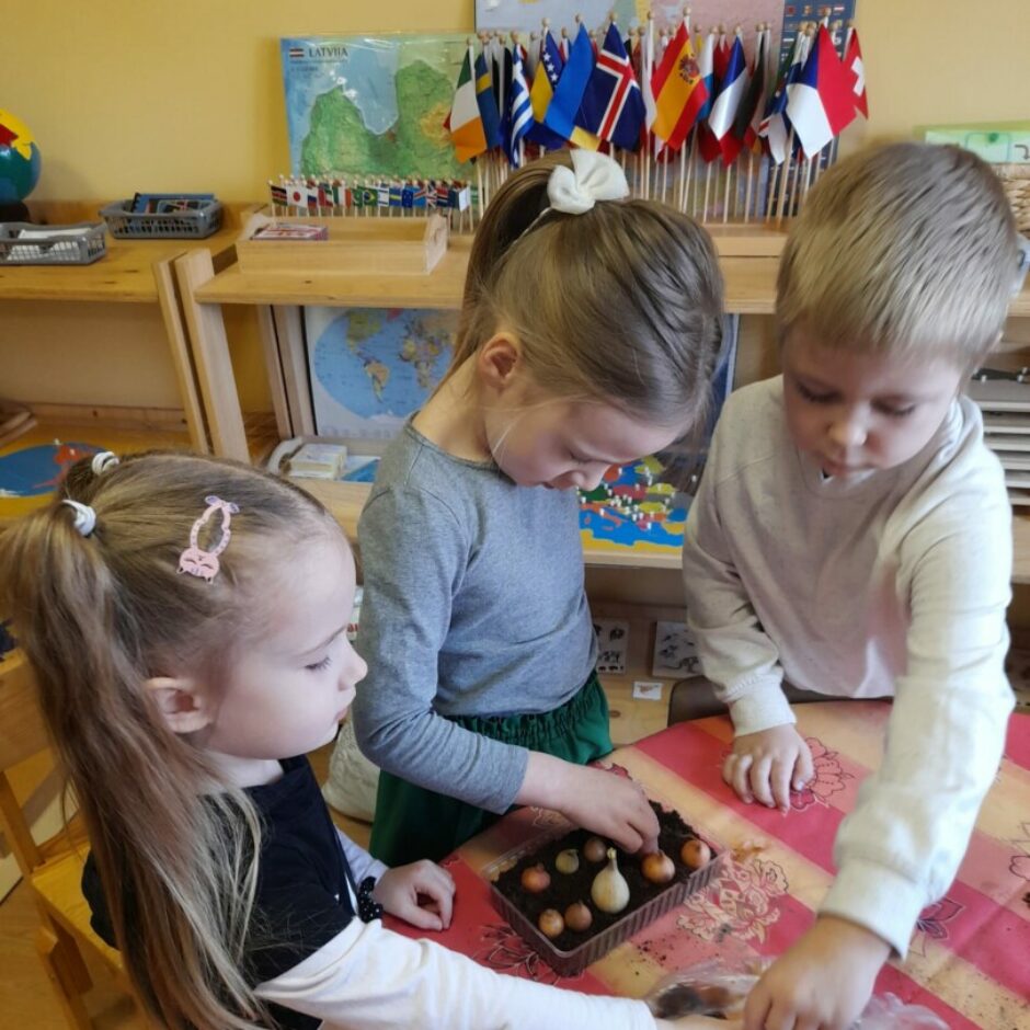 Kā katru gadu, arī šogad pavasaris pirmsskolā iesākās ar sēšanas darbiem. Tika sēti tomāti, gurķi, vasaras puķes, dažādi zaļumi, kā arī stādīti sīpoli, lai izaugušos lokus izmantotu kā vitamīnu avotu. Bērni mācījās atšķirt dažādu augu sēklas, mazākie iepazina augsni, izpētīja tās īpašības. Pašu audzētie gurķu un tomātu stādi tiks iestādīti siltumnīcā, bet puķu stādi augs grupu laukumā, kur visas vasaras garumā puķes priecēs ar skaistiem ziediem.