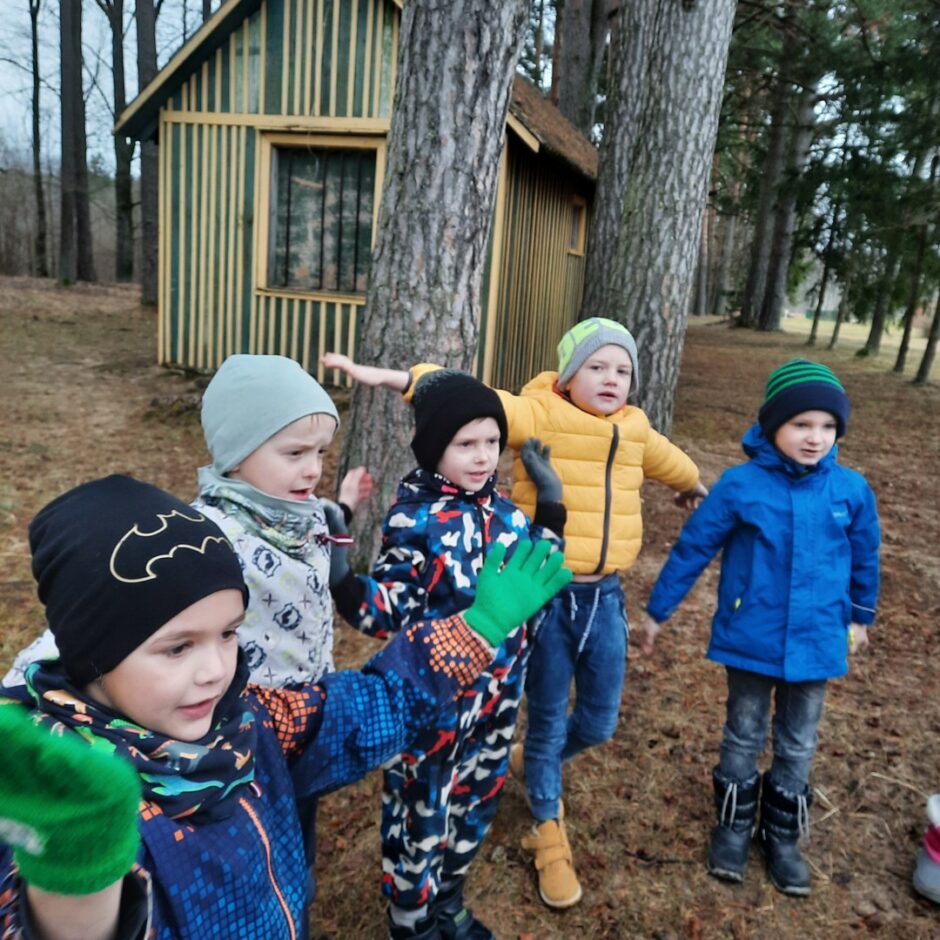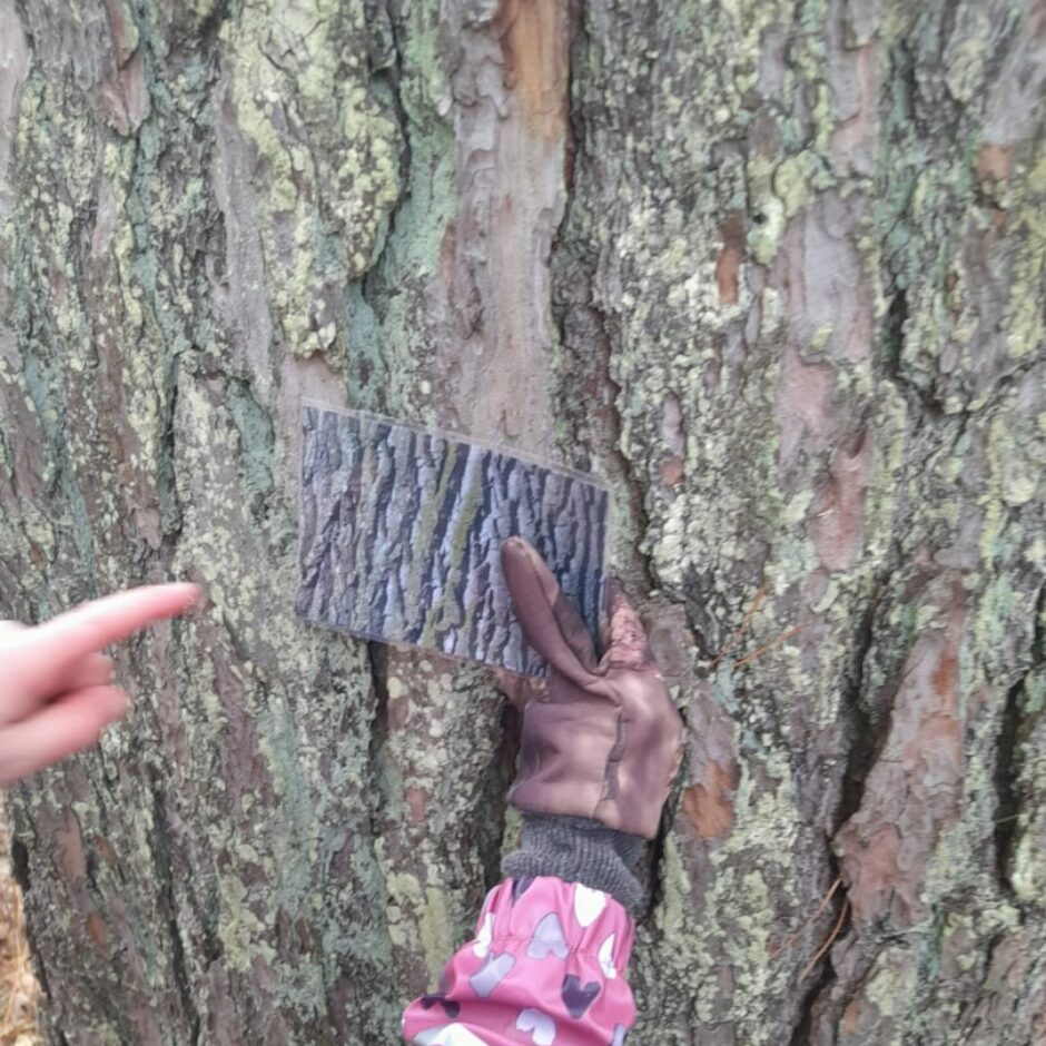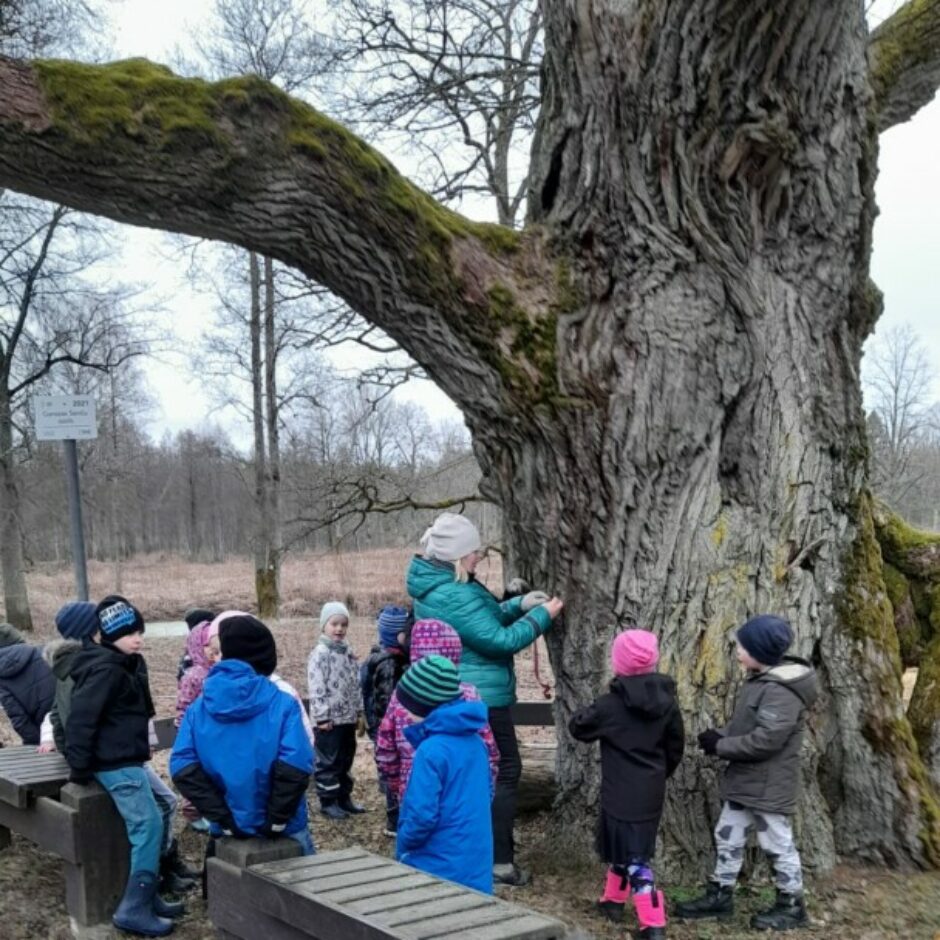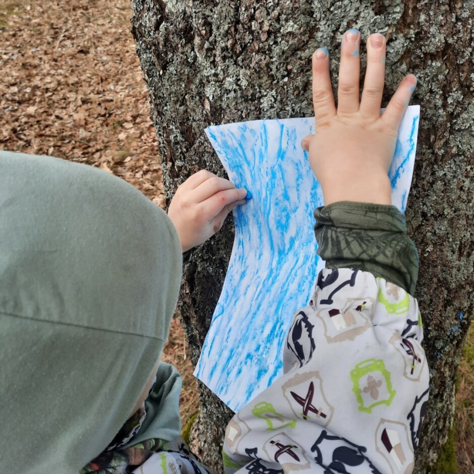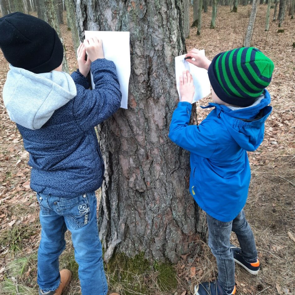 Martā 5 – 6 gadīgās grupas bērni turpināja iepazīt tuvākajā apkārtnē augošos kokus. Pēc taustes un redzes noteica koku mizas, atpazina koku sugas pēc to mizas dabā un attēlos. Ar vaska krītiņu veidoja koku mizas faktūru uz papīra.