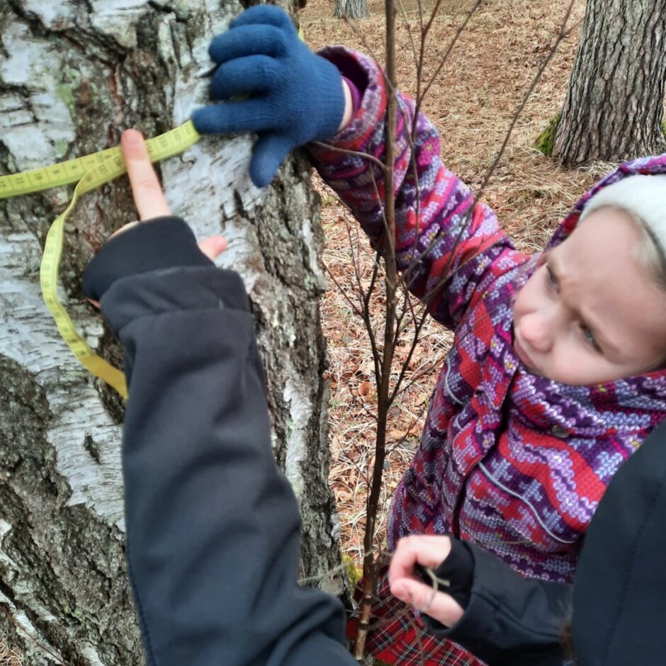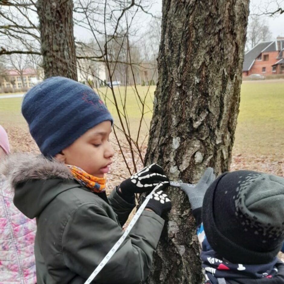 Praktiski darbojās ar mērlentu, mērot koku apkārtmēru. Salīdzināja kokus pēc to apkārtmēra. Uzdevumus veica individuāli, pāros un apakšgrupās.