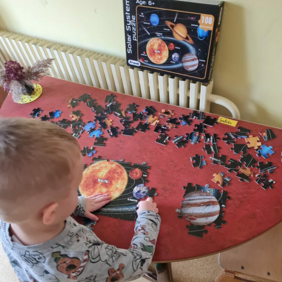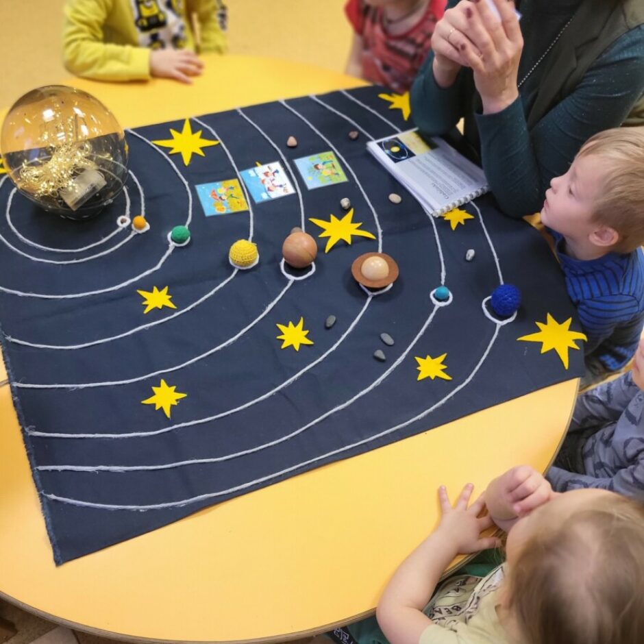 Janvāra mēneša tēmas “Saules gads” ietvaros grupas “Ežuki” bērni kopā ar skolotājām skaidroja, kas ir saule, kas ir planētas un kā tās sauc. Pielietojot 4D tehnoloģiju, ik vienam bija iespēja aplūkot katru no Saules sistēmas planētām. Bērniem tika piedāvāti dažādi materiāli, lai labāk izzinātu pētāmo tēmu.
