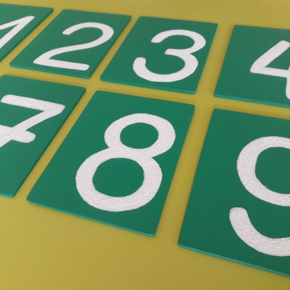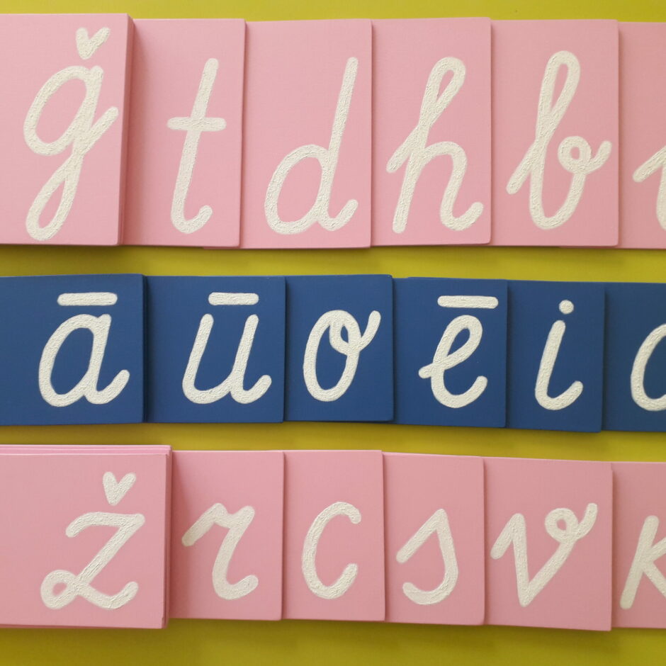 Pirmsskolas 5…6 gadīgie bērni jau labu laiku apgūst burtus un ciparus, izmantojot Montesori materiālu – smilšpapīta burtu un ciparu tāfelītes.