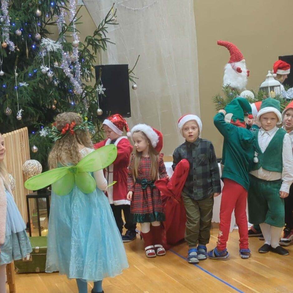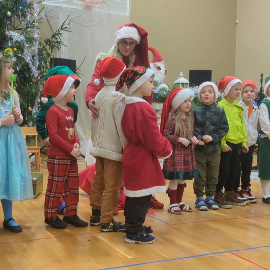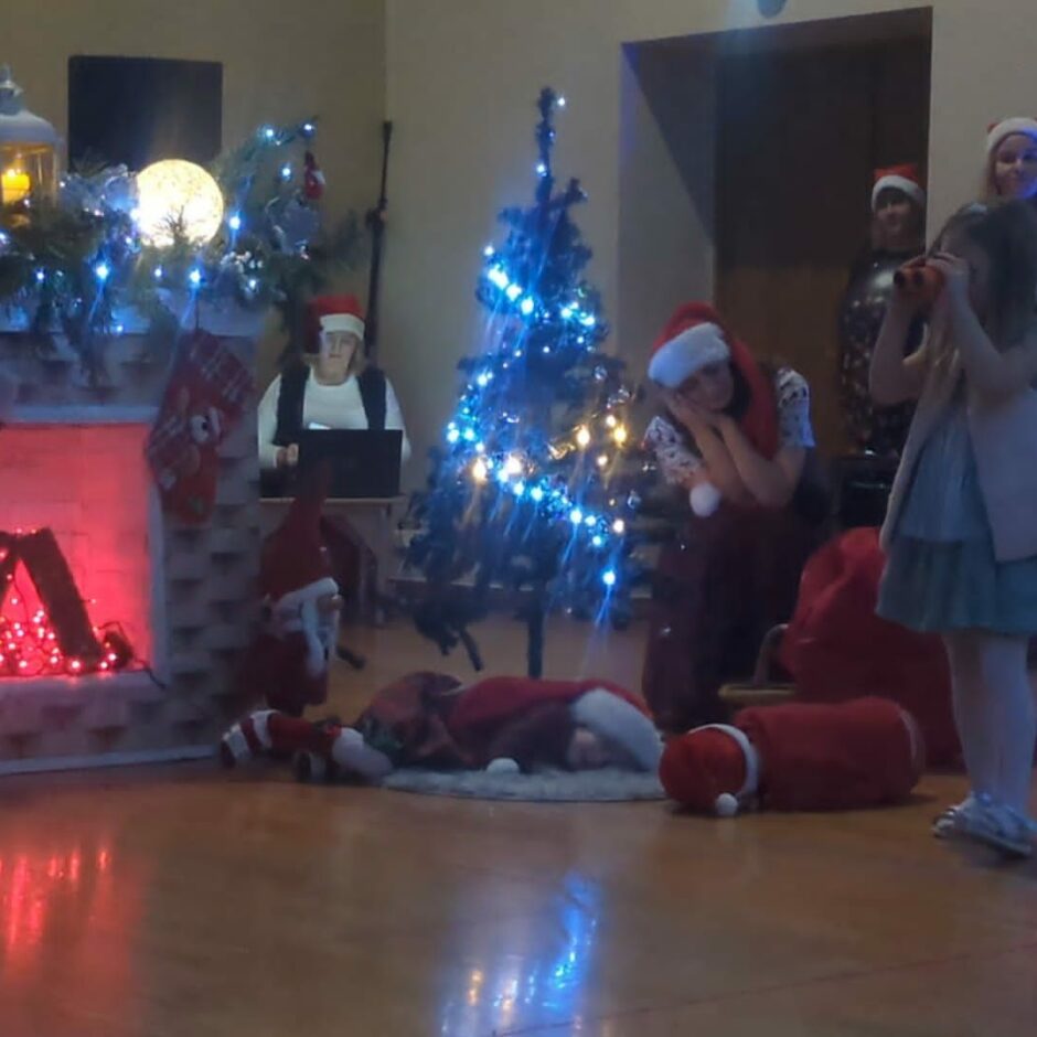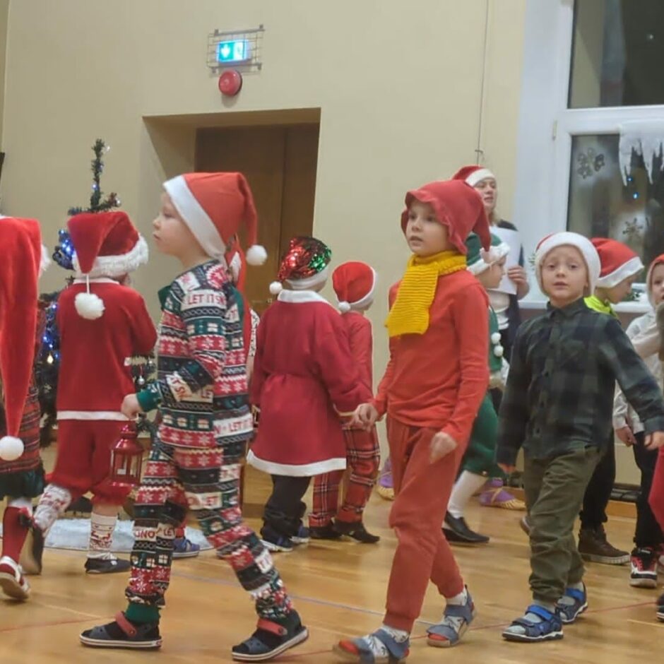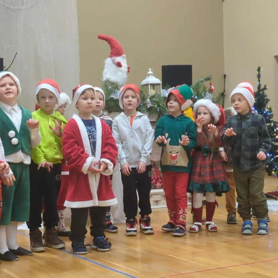 5 – 6 gadīgās grupas bērni Ziemassvētkus ieskandināja ar lugu “Ziemassvētki Rūķu ciemā”, kuru papildināja ar Ziemassvētku dziesmām un jautrām dejām. Pasākuma noslēgumā katrs tika pie dāvanas, kas iepriecināja mazo sirsniņu.